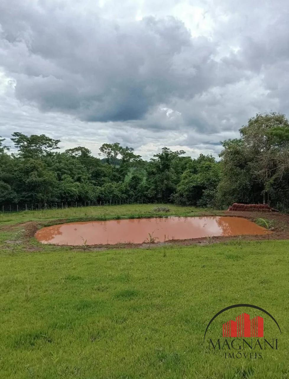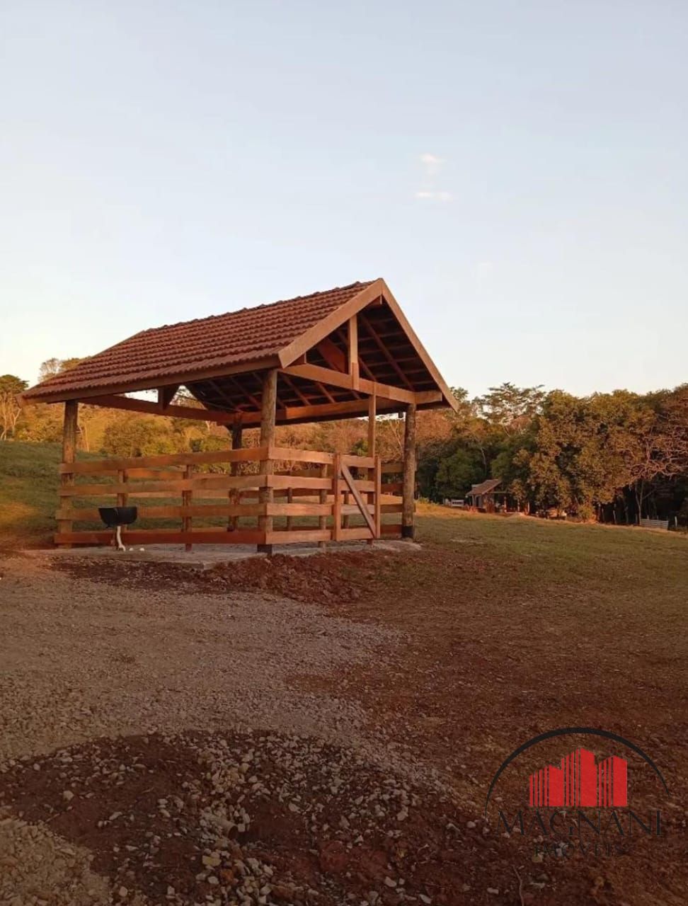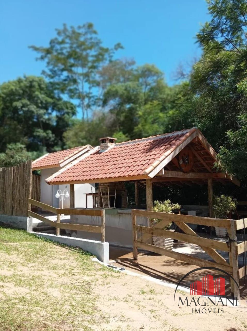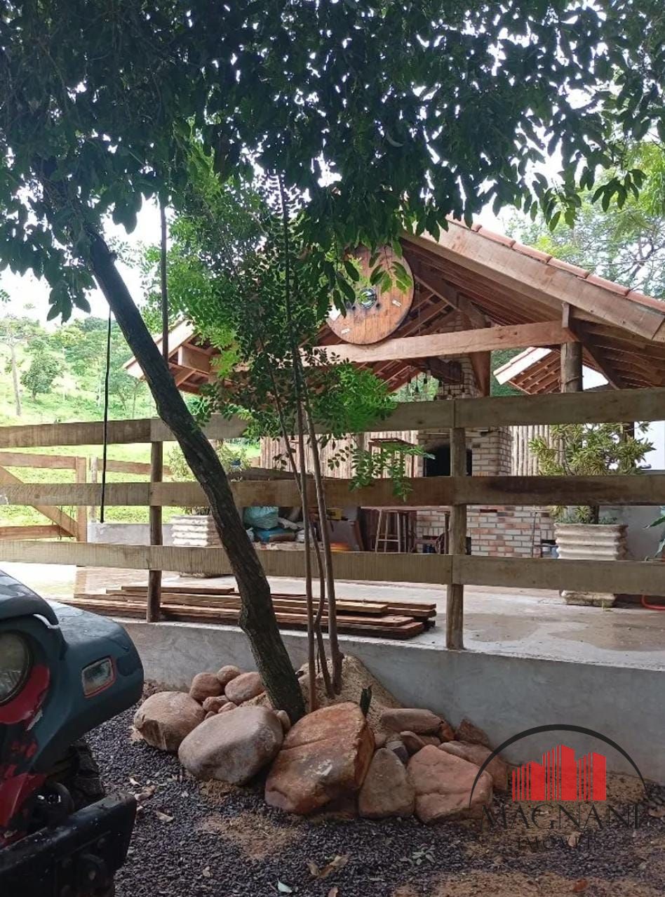 A chácara possui uma área de lazer construída com 70m² com banheiro e churrasqueira