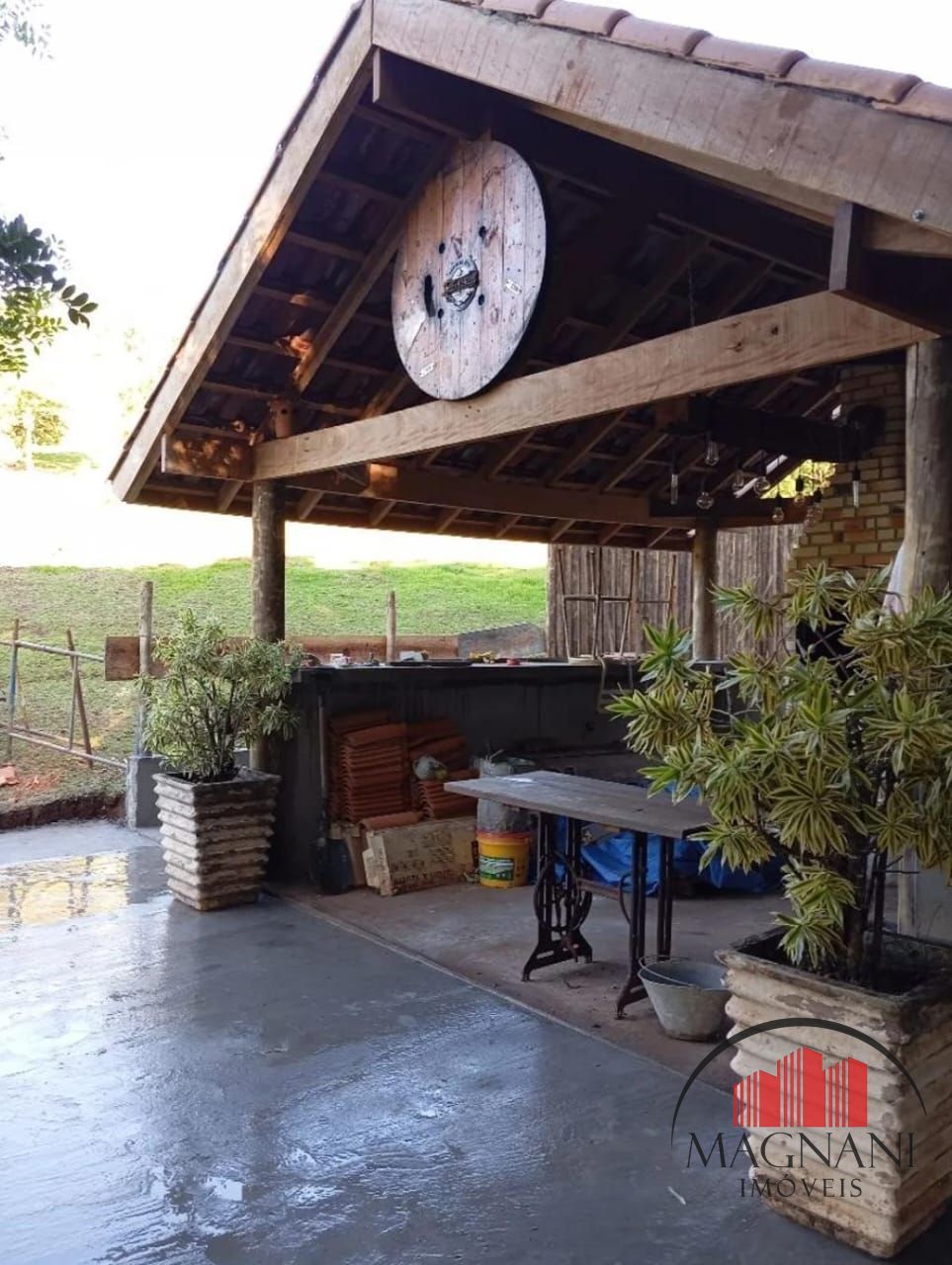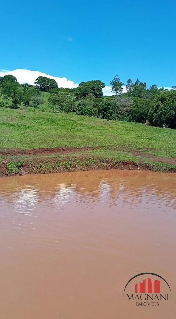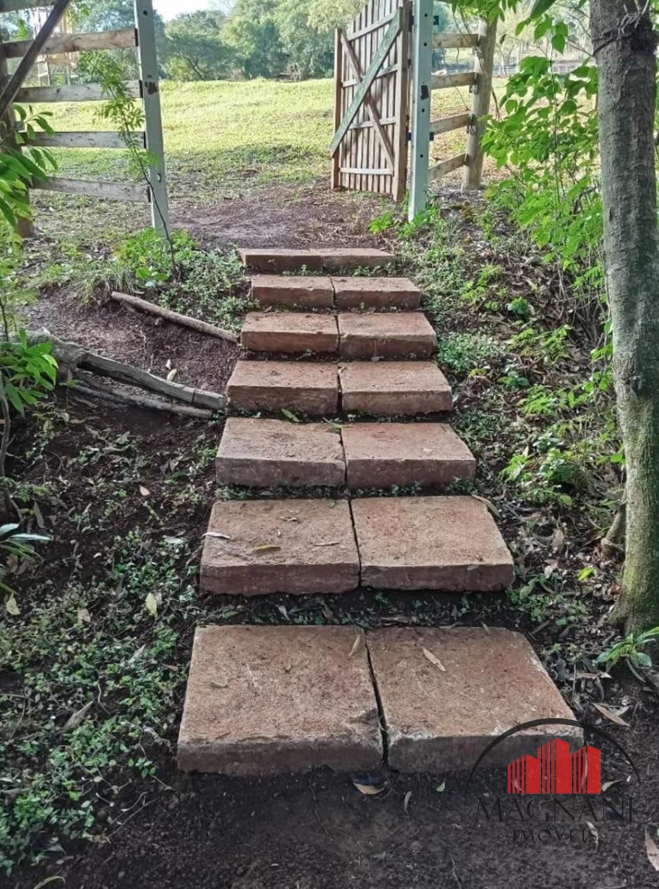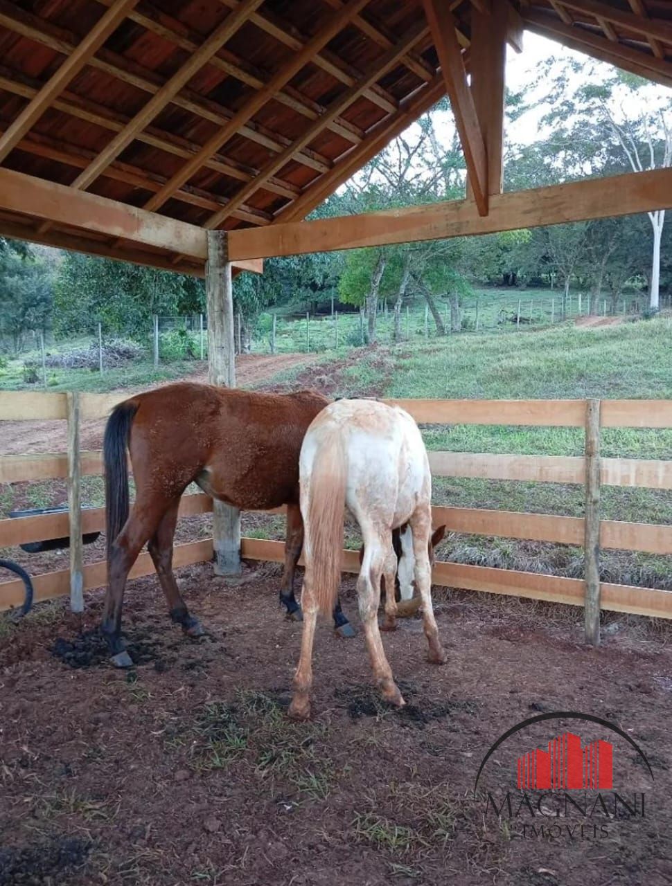 A chácara possui uma área de lazer construída com 70m² com banheiro e churrasqueira